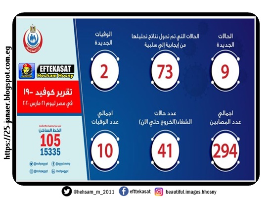 عاجل | وزارة الصحة المصرية: ارتفاع عدد الإصابات بفيروس كورونا إلى 294 وإجمالي الوفيات 10