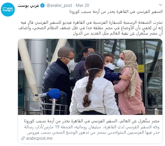 نشرت الصفحة الرسمية للسفارة الفرنسية في القاهرة فيديو للسفير الفرنسي قال فيه إنه لن يُخفي بأن الأوضاع في مصر مقلقة جدا في ظل ضعف النظام الصحي، وأضاف أن مصر ستُعزل عن بقية العالم مثل العديد من الدول