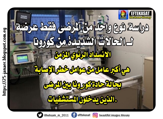 ووجدت الدراسة أن الحالة المعروفة باسم الانسداد الرئوي المزمن، وهو مرض يسبب مشاكل في التنفس على الأمد الطويل؛ هي أكبر عامل من عوامل خطر الإصابة بحالة حادة من كوفيد-19 بين المرضى الذين يدخلون المستشفيات.