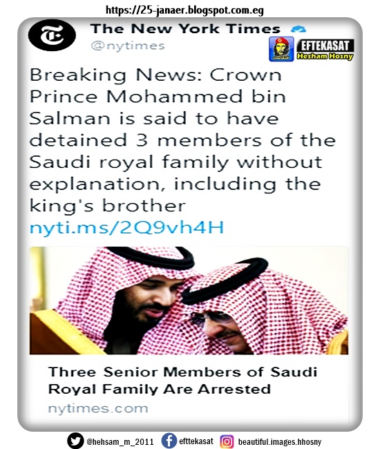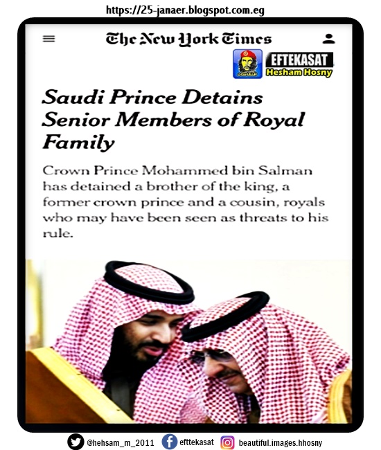 نيويورك_تايمز : بن سلمان يعتقل ثلاثة من الأمراء ممن يعتبرهم تهديداً له ، وهم الأمير أحمد بن عبدالعزيز (شقيق الملك )والأمير محمد بن نايف( ولي العهد السابق)والأمير عبدالعزيز بن سعود (وزير الداخلية)
