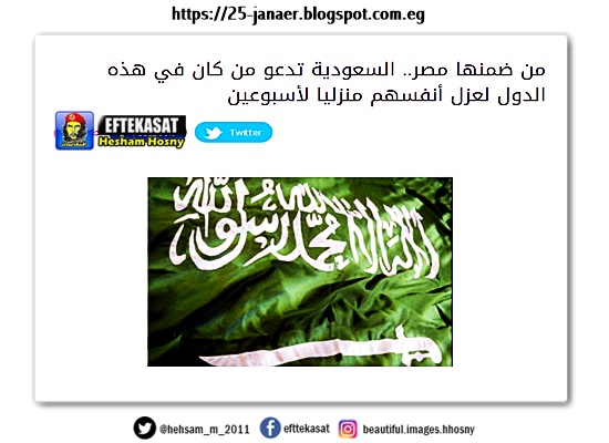 دعت المملكة العربية السعودية من كان في لبنان ومصر وإيطاليا و كوريا الجنوبية لعزل أنفسهم منزليًا لأسبوعين من تاريخ عودتهم، وذلك حسبما نقلا عن وكالة الأنباء السعودية "واس"، مساء اليوم السبت.