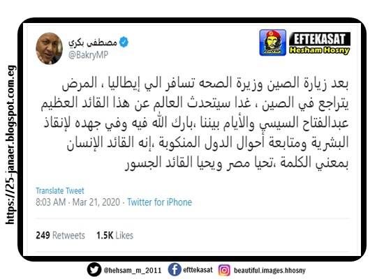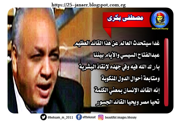 مصطفى بكرى غدا سيتحدث العالم عن هذا القائد العظيم السيسي والأيام بيننا بارك الله فيه وفي جهده لإنقاذ البشرية ومتابعة أحوال الدول المنكوبة إنه القائد الإنسان بمعني الكلمة تحيا مصر ويحيا القائد الجسور