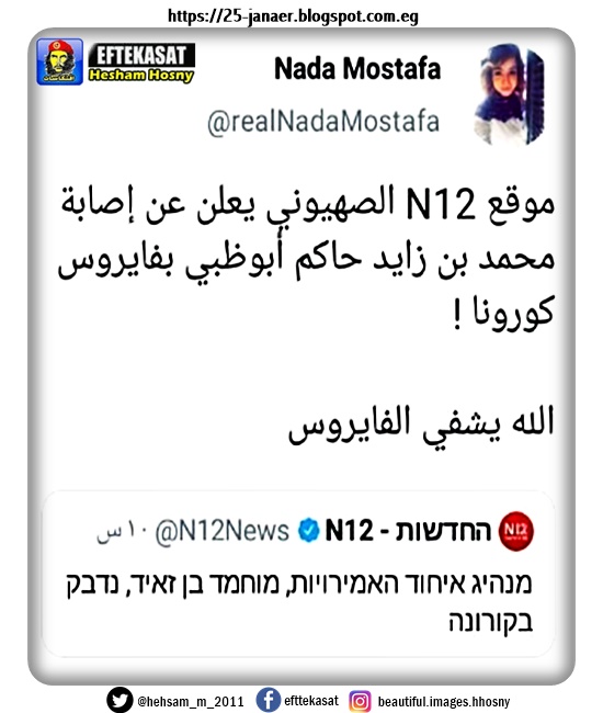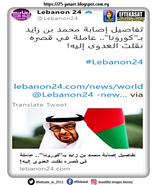 القناة N25 الاسرائيلية : نقل ولي عهد ابوظبي محمد بن زايد الى المستشفى يعد تأكيد اصابته بفيروس كورونا .