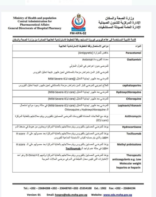 حددت وزارة الصحة ، قائمة بالأدوية المستخدمة في علاج فيروس كورونا المستجد، وأرسلت منشورًا بها إلى مديريات الصحة بجميع المحافظات.
