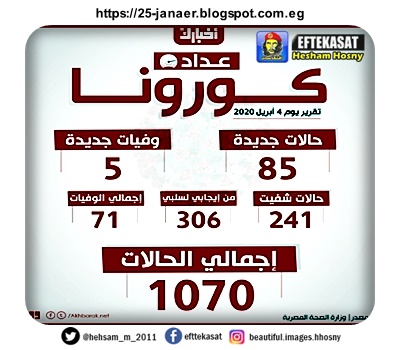 مصر تتخطى لأول مرة الـ 1000 حالة منذ تفشي الفيروس بها .. عدد الحالات يصل إلى 1070 حالة وإجمالي الوفيات يبلغ 71 حالة