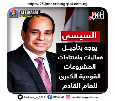 السيسى يوجه بتأجيل فعاليات وافتتاحات المشروعات القومية الكبرى للعام بما في ذلك الانتقال إلى العاصمة الإدارية الجديدة، وكذلك افتتاح المتحف المصرى الكبير ومتحف الحضارة المصرية،