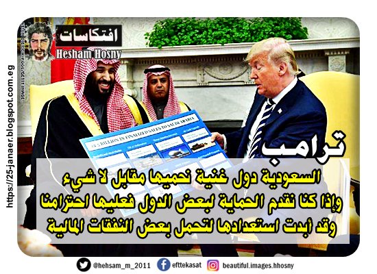 عاجل | ترامب: السعودية دول غنية نحميها مقابل لا شيء وإذا كنا نقدم الحماية لبعض الدول فعليها احترامنا وقد أبدت استعدادها لتحمل بعض النفقات المالية