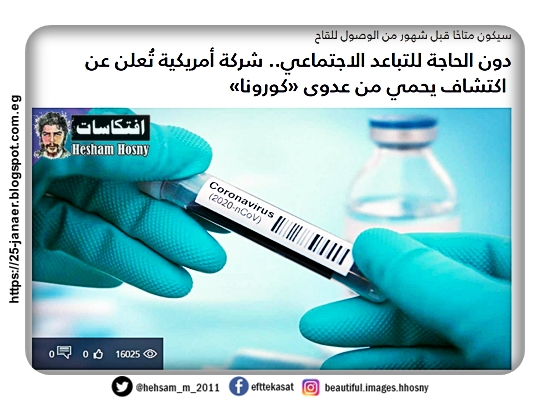 دون الحاجة للتباعد الاجتماعي.. شركة أمريكية تُعلن عن اكتشاف يحمي من عدوى «كورونا» سيكون متاحًا قبل شهور من الوصول للقاح اكتشاف جسم مضاد يمكنه حماية الإنسان من التقاط عدوى فيروس كورونا المستجد بنسبة 100%.