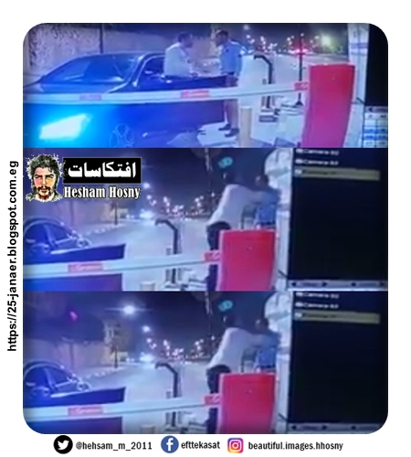 وهو يستقل سيارته، ثم نزل منها، وتحدث مع فرد الأمن، ثم اختفى لثوانى وعاد، وقبل أن يستقل سيارته للمرة الثانية، دفع فرد الأمن بشكل قوى، ثم ركب سيارته.