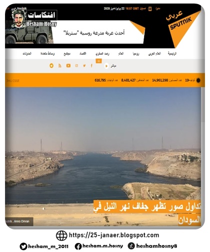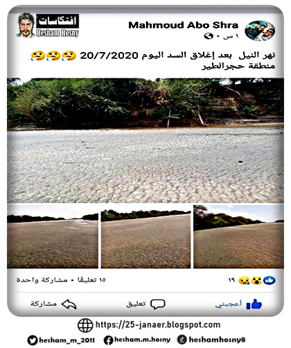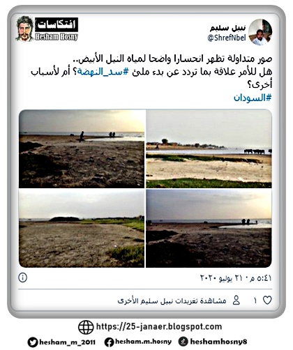 ونشر حساب يحمل اسم منتصر الجكيكة، وهو إعلامي سوداني مستقل، بحسب توصيفه على صفحته في "تويتر"، صورا لجفاف نهر النيل مع تعليق جاء فيه "صور متداوله، انحسار كبير لنهر النيل بعدد من المناطق، الصور من منطقة حجر الطير محلية المتمه".