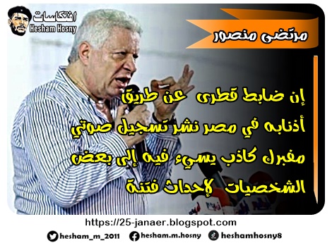 وأضاف مرتضى منصور: ما حدث من الضابط القطري فشل لأنه أن نجح في تقليد الصوت"، متسائلا أين صورتي وأنا أتحدث.. بطل قذارة وتم كشفك أمام الرأي العام لمعرفة غباءك".