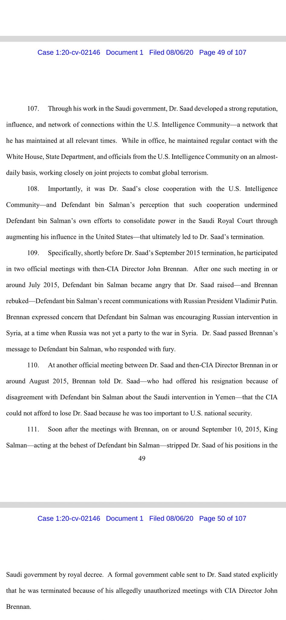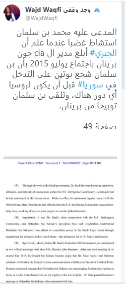 المدعى عليه محمد بن سلمان استشاط غضبا عندما علم أن #الجبري أبلغ مدير ال cia جون برينان باجتماع يوليو 2015 بأن بن سلمان شجع بوتين على التدخل في #سوريا قبل أن يكون لروسيا أي دور هناك، وتلقى بن سلمان توبيخا من برينان.