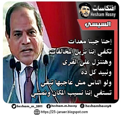 السيسي إحنا جبنا معدات تكفي إننا نزيل المخالفات وهننزل على القرى ونبيد كل ده ولو الناس مش عاجبها تبقى تستفي إننا نسيب المكان ونمشي
