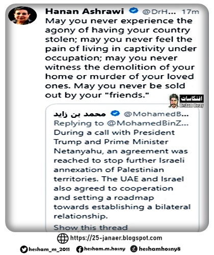 عاااجل .. حنان عشراوى ترد على تغريدة محمد بن زايد -=- قد لا تعاني أبدًا من معاناة تعرض بلدك للسرقة ؛ قد لا تشعر أبدًا بألم العيش في الأسر تحت الاحتلال ؛ قد لا تشهد أبدًا هدم منزلك أو قتل أحبائك. قد لا يتم بيعك أبدًا من قبل "أصدقائك".