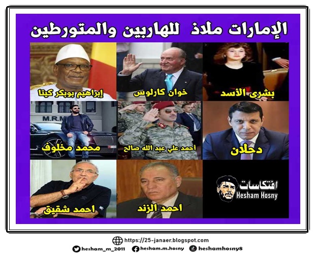 الإمارات ملاذ للهاربين والمتورطين إبراهيم بوبكر كيتا خوان كارلوس بشرى الأسد شقيقة بشار الأسد محمد مخلوف ابن خالة بشار الأسد أحمد علي عبد الله صالح دحلان رجل بن زايد الفريق أحمد شفيق أحمد الزند وزير العدل السابق