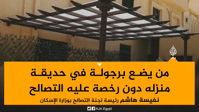 "من يضع برجولة في حديقة منزله بدون رخصة يسجل له محضر مخالفة وعليه التصالح".. تصريحات متلفزة لرئيسة لجنة الرد على استفسارات قانون #التصالح نفيسة هاشم
