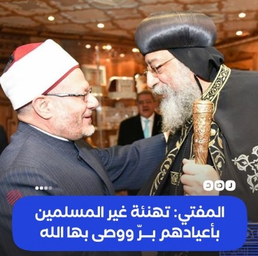موصيًا بتهنئة المسيحيين.. مفتي الجمهورية شوقي علام: «تهنئة غير المسلمين بأعيادهم بر، وأوصى بها الله.. فهل الذهاب لتهنئة غير المسلم في الكنيسة اعتراف منا بالدين الآخر؟»