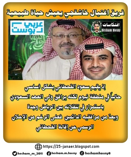 إذ يقيم سعود القحطاني بشكل أساسي حالياً في منطقة نيوم لكنه يرافق ولي العهد السعودي باستمرار في تنقلاته بين الرياض وجدة ويعدّ من مرافقيه الدائمين، فعلى الرغم من الإعلان الرسمي عن إقالة القحطاني، الذي يعتبر الذراع اليمنى لبن سلمان، من منصب مستشار بالديوان الملكي، وهو أكبر شخصية ضالعة في الجريمة، فإنه لا يزال يباشر عمله كمستشار ومرافق خاص لولي العهد السعودي.