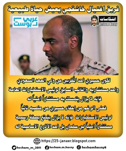 ولكون عسيري أحد المُقربين من ولي العهد السعودي وأحد مستشاريه والنائب السابق لرئيس الاستخبارات العامة، فإنه لا يزال يتمسك به مستشاراً أمنياً له، فعلى الرغم من إعفاء عسيري من منصبه نائباً لرئيس الاستخبارات في 20 أكتوبر/تشرين الأول 2018 عقب إعلان السلطات السعودية مقتل الصحفي جمال خاشقجي فإنه لا يزال يتمتع بصفة رسمية مستشاراً أمنياً لبن سلمان بل أحد الأذرع الاساسية له هو والقحطاني.
