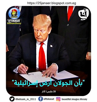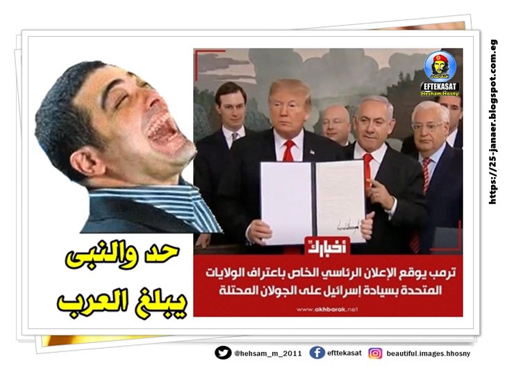 ترامب يدعو للاعتراف بسيادة إسرائيل على الجولان ونتانياهو يرحب والعرب مشغولين بالاهلى والزمالك وقضية شيرين وهيئة الترفية و الحفلات الغنائية وعمرة دينا الرقاصة والكلبانى والكوتشينة