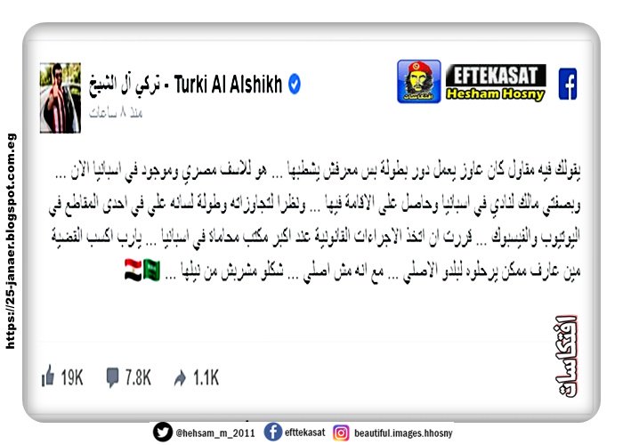 وكتب "آل الشيخ" عبر "فيس بوك": "يقولك فيه مقاول كان عاوز يعمل دور بطولة بس معرفش يشطبها، هو للأسف مصري وموجود في إسبانيا الآن، وبصفتي مالك لناد في إسبانيا وحاصل على الإقامة فيها، ونظرا لتجاوزاته وطولة لسانه علي في إحدى المقاطع في اليوتيوب والفيسبوك، قررت أن اتخذ الإجراءات القانونية عند أكبر مكتب محاماة في إسبانيا".