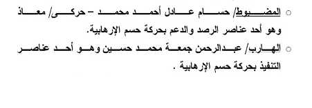 وكشفت الداخلية، العناصر الإرهابية المشاركة في تنفيذ الحادث الإرهابي، وهم "عبد الرحمن خالد"، هارب من أحكام في 2018، وحسام عادل محمد (عنصر دعم)، وإبراهيم خالد (شقيق الانتحاري)، وإسلام قرني محمد عنصر حركة حسم، وأطلق النيران على القوات ولقي مصرعه.