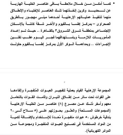 وأوضحت وزارة الداخلية، أنها تمكنت من مداهمة وكرين في مركز أطسا ومدينة الشروق، اتخذت منهما عناصر الخَلِيَّة الإرهابية وكرًا للاختباء والانطلاق منهما لتنفيذ عملياتهم، مشيرة إلى أن عملية الفحص والتتبع توصلت لتحديد خط سير السيارة المستخدمة في التفجير