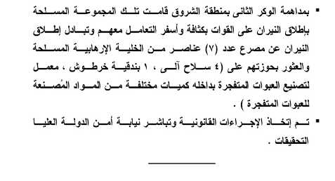 قتل 7 عناصر إرهابية من خلية حسم الإرهابية، المتورطة في حادث معهد الأورام، في تبادل لإطلاق النار مع قوات الشرطة بالشروق.