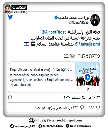 وغردت وزيرة الثقافة والشباب الإماراتية نورة بنت محمد الكعبي عبر حسابها الرسمي في تويتر قائلة: "فرقة النور الإسرائيلية، تقدم معزوفة جميلة من ألحان الفنان الإماراتي حسين الجسمي، بمناسبة معاهدة السلام"، مضيفةً بالعبرية: "سأحبك".