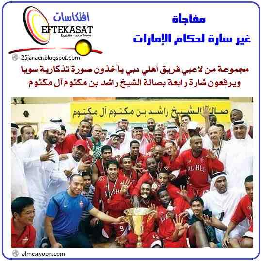 صورة : لاعبي فريق أهلي دبي ويرفعون شارة رابعة بصالة الشيخ راشد بن مكتوم !