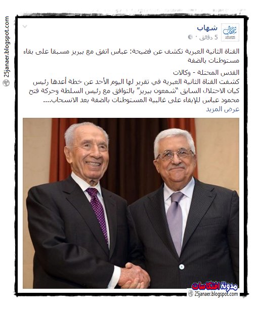 القناة الثانية العبرية تكشف عن فضيحة: عباس اتفق مع بيريز مسبقا على بقاء مستوطنات بالضفة
