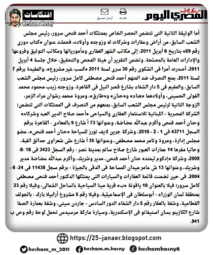 أما الوثيقة الثانية التى تتضمن الحصر الخاص بممتلكات أحمد فتحى سرور، رئيس مجلس الشعب السابق، من أراض وعقارات وشركات له وزوجته وأولاده، فحملت عنوان «كتاب دورى رقم 89» بتاريخ 6 أبريل 2011، إلى مكاتب الشهر العقارى ومأمورياتها ومكاتب التوثيق وفروعها والإدارات العامة بالمصلحة. وتضمن التقرير أن هيئة الفحص والتحقيق، خلال جلسة 4 أبريل 2011، أصدرت أمرا فى الشكوى رقم 30 سرى لسنة 2011 «كسب غير مشروع»، والمقيدة برقم 7 لسنة 2011، بمنع التصرف ضد المتهم أحمد فتحى مصطفى كامل سرور، رئيس مجلس الشعب السابق، والمقيم فى 5 دار الشفاء بشارع قصر النيل فى القاهرة، وزوجته زينب محمود محمد الفولى الحسينى، وأولادهما «هناء» و«حنان» و«طارق»، ومروة محمد رشوان مراد الزمر، الزوجة الثانية لرئيس مجلس الشعب السابق، بمنعهم من التصرف فى الممتلكات التى تتضمن: الشركة المصرية - اللبنانية للاستثمار العقارى والسياحى «أحمد صلاح الدين العبد وشركاه» وحنان أحمد فتحى وأكرم عبدالله عضاضة، وعنوانها 73 أ شارع 9 بالمعادى - القاهرة برقم السجل 43711 فى 1 - 2 - 2010، وشركة جرين لايف تورز للسياحة «حنان أحمد فتحى»، عضو مجلس إدارة، ومروة وتامر محمد مصطفى، وعنوانها 35 أ شارع على شعراوى حدائق القبة، وحاليا مقرها 14 عمارات العبور شارع صلاح سالم بمدينة نصر - رقم السجل 3423 فى 18 -8-2008، وشركة «إدكوم ليمتد» حنان أحمد فتحى، مدير وشريك، وأكرم عبدالله عضاضة مدير وشريك، وعنوانها 13 ش عامر ميدان المساحة فى الدقى بالجيزة - برقم سجل 11438 فى 24- 6 - 2004. فى حين تضمنت قائمة العقارات والسيارات التى يمتلكها الدكتور أحمد فتحى مصطفى كامل سرور: فيلا بالعنوان 10 ياقوتة «ب» قرية مينا السياحية بالساحل الشمالى، وفيلا رقم 23 بمنطقة لسان الوزراء - أبوسلطان فى الإسماعيلية، وفيلا رقم 5 مشروع أرابيلا بارك - بالجولف القطامية، وشقة بالعقار رقم 5 دار الشفاء الدور السادس - جاردن سيتى، وشقة بعمارة الصفا شارع الكازينو بسان استيفانو فى الإسكندرية، وسيارة ماركة مرسيدس تحمل لوحة رقم وص ب 941.